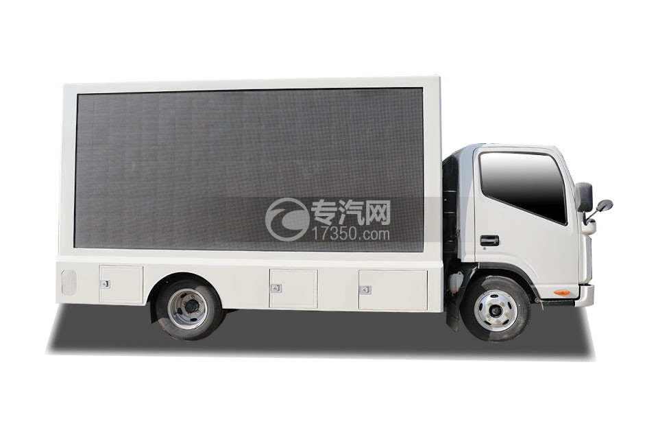 江淮国五LED广告宣传车采用江淮原厂环卫底盘,搭载潍柴130马力发动机,5档变速箱,7.00R16轮胎,标配ABS、助力转向、空调等配置。上装厢体采用5CM复合钢架箱体,外冷轧钢板,箱体外部左侧为全防水高清户外P10彩屏,另侧带单红字幕屏2-7副灯画切换滚轴灯箱,后部为单色条屏。可根据用户使用需求选装双面或三面全彩屏幕,选装手动或自动舞台装置。