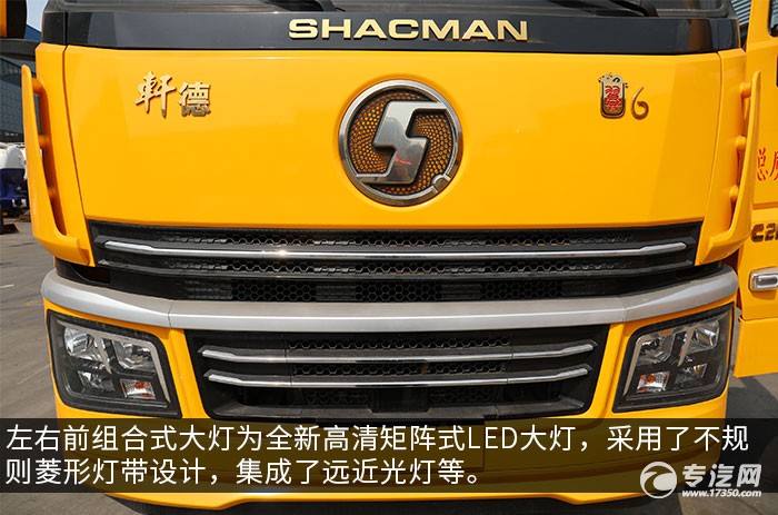 这款车采用陕汽轩德翼6平顶排半驾驶室,前脸进气格栅并不夸张,采用蜂巢式设计,整体非常的协调,采用银色的镀铬线条装饰隔开,增加了美观的同时,整体感觉更有气势和层次感。