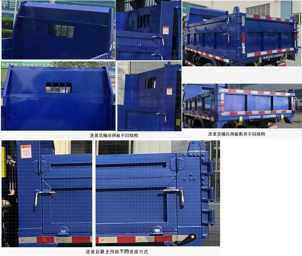 | 其它 | 扩展 | 后卸;防护装置材质为Q235,采用螺栓连接方式;后下部防护装置截面高×宽为30×130,离地高度为415mm;ABS系统型号/厂家: XN-3730601/济南鑫宁汽车配件有限公司,CM4XL-4S/4M/广州瑞立科密汽车电子股份有限公司,XH-KQ4S4M-E01/广州市西合汽车电子装备有限公司;CA4DB1-13E6发动机对应油耗值为14.5L/100km;选装不同外观的货箱;选装新前围和前部灯具;选装货箱上部不同遮挡;选装不同视镜安装位置;尺寸对应关系:外形尺寸5680×2095×2440对应货箱内部尺寸3400×2000×690、3400×2000×490、3400×1915×690、3400×1915×490、3400×1870×690和3400×1870×490,外形尺寸5680×2045×2440对应货箱内部尺寸3400×1915×690、3400×1915×490、3400×1870×690和3400×1870×490;轴距3000对应后悬1510,轴距3150对应后悬1360,单位为mm | 后卸;防护装置材质为Q235,采用螺栓连接方式;后下部防护装置截面高×宽为30×130,离地高度为415mm;ABS系统型号/厂家: XN-3730601/济南鑫宁汽车配件有限公司,CM4XL-4S/4M/广州瑞立科密汽车电子股份有限公司,XH-KQ4S4M-E01/广州市西合汽车电子装备有限公司;CA4DB1-13E6发动机对应油耗值为14.5L/100km;选装不同外观的货箱;选装新前围和前部灯具;选装货箱上部不同遮挡;选装不同视镜安装位置;尺寸对应关系:外形尺寸5680×2095×2440、5680×2095×2350、5680×2095×2255均可对应货箱内部尺寸3400×2000×690、3400×2000×490、3400×1915×690、3400×1915×490、3400×1870×690和3400×1870×490,外形尺寸5680×2045×2440、5680×2045×2350、5680×2045×2255均可对应货箱内部尺寸3400×1915×690、3400×1915×490、3400×1870×690和3400×1870×490;轴距3000对应后悬1510,轴距3150对应后悬1360,单位为mm;选装前挡板不同结构;选装货箱后挡板侧开不同结构;选装货箱上挡板不同连接方式 |