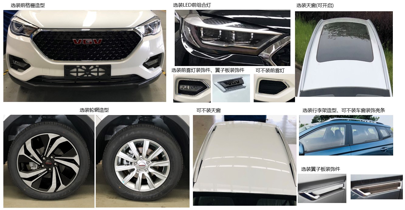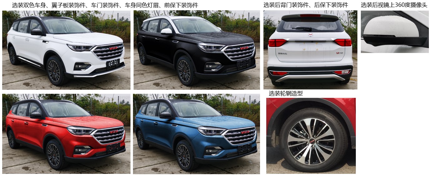 | 其它 | 扩展 | 选装前格栅造型、LED前组合灯、前雾灯装饰件、翼子板装饰件、轮辋造型、天窗(可开启)、行李架造型;可不装前雾灯、天窗、后雨刮、车窗装饰亮条.该车装配ABS(型号: ESP9,生产企业:博世汽车部件(苏州)有限公司);发动机最大净功率:102kW. | 选装前格栅造型、LED前组合灯、前雾灯装饰件、翼子板装饰件、轮辋造型、天窗(可开启)、行李架造型、双色车身、车门装饰件、车身同色灯眉、前保下装饰件、后背门装饰件、后保下装饰件、后视镜上360度摄像头;可不装前雾灯、天窗、后雨刮、车窗装饰亮条.该车装配ABS(型号: ESP9,生产企业:博世汽车部件(苏州)有限公司);发动机最大净功率:102kW. |