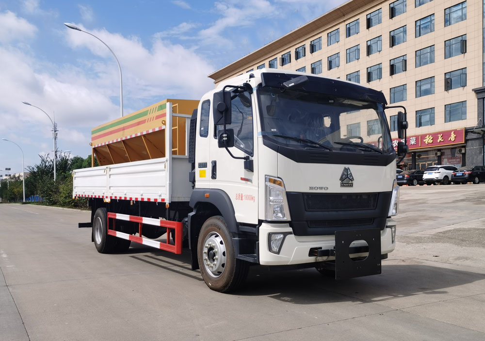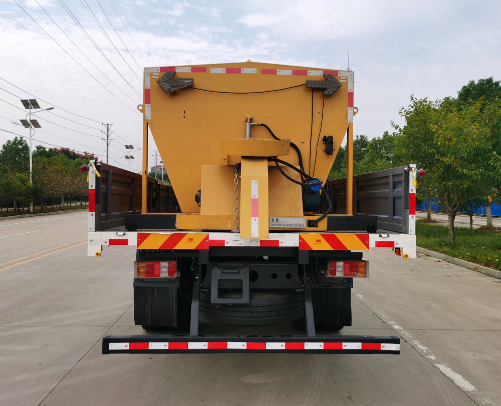 在上装配置上,该车整车外形尺寸为:9250,9080,10450,10280×2550×3020(mm),用户需根据自我实际作业环境选择适合工况的车型。这款除雪车专用装置安装的是不小2吨的融雪撒布机,V型料仓采用碳钢制作,内部做三级防腐处理,结构简单,操作方便,使融雪剂自动落料,出料万全,无残留;