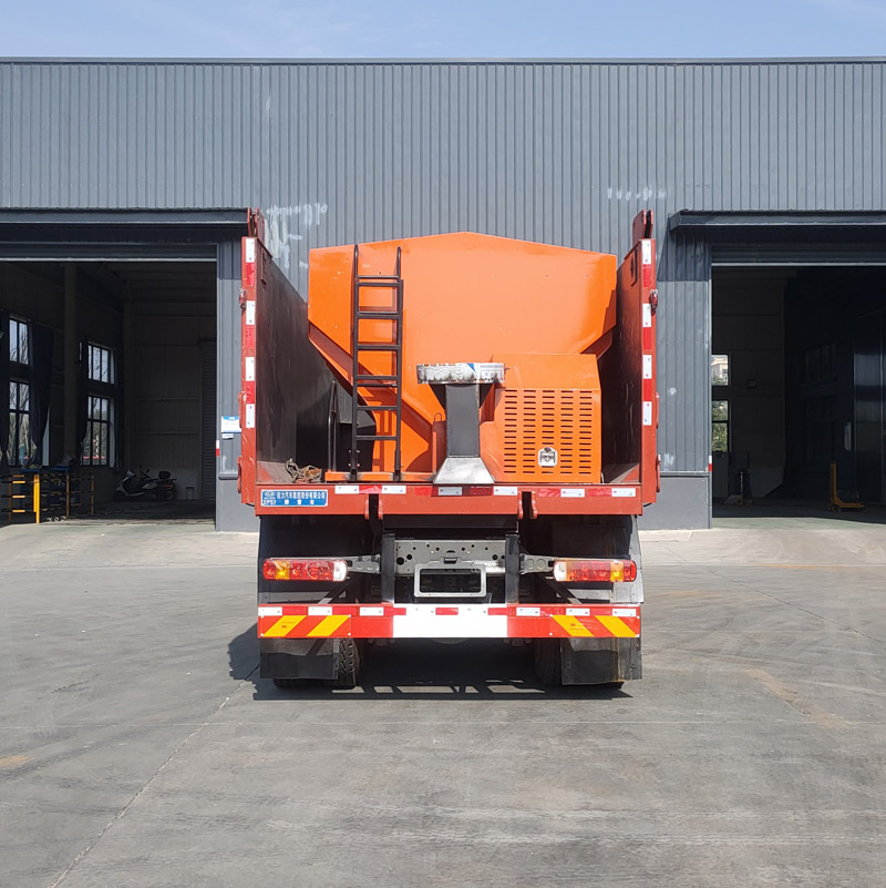 在上装配置上,该车整车外形尺寸为:8750×2550×3360(mm),用户需根据自我实际作业环境选择适合工况的车型。这款除雪车专用装置安装的是不小2吨的融雪撒布机,V型料仓采用碳钢制作,内部做三级防腐处理,结构简单,操作方便,使融雪剂自动落料,出料万全,无残留;