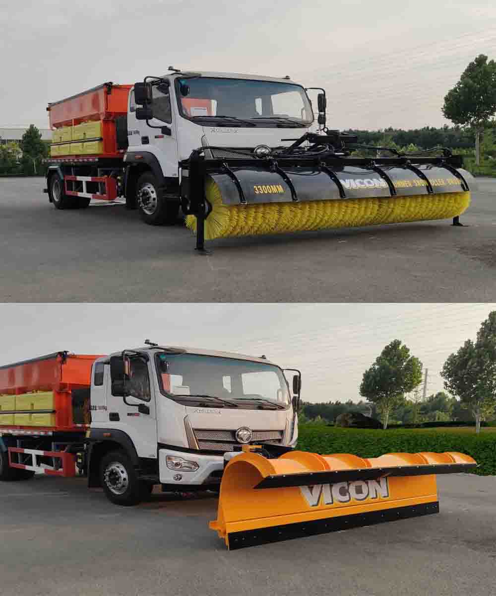 这款除雪车车前还可以安装自带动力的滚雪刷或者除雪铲,滚雪刷转速可根据雪情和路况进行自动调节,节能环保。滚雪刷操作简便,在驾驶室内安装独立电控操作装置,作业安全可靠,操作方便。