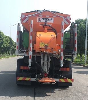 在上装配置上,该车整车外形尺寸为:9780,9340,11790,11610,11350,11170×2550,2500×3930,3630,3440,3310(mm),用户需根据自我实际作业环境选择适合工况的车型。这款除雪车专用装置安装的是不小2吨的融雪撒布机,V型料仓采用碳钢制作,内部做三级防腐处理,结构简单,操作方便,使融雪剂自动落料,出料万全,无残留;