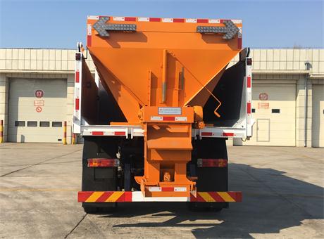 在上装配置上,该车整车外形尺寸为:10591,10190,9206,8471×2520×3130(mm),用户需根据自我实际作业环境选择适合工况的车型。这款除雪车专用装置安装的是不小2吨的融雪撒布机,V型料仓采用碳钢制作,内部做三级防腐处理,结构简单,操作方便,使融雪剂自动落料,出料万全,无残留;