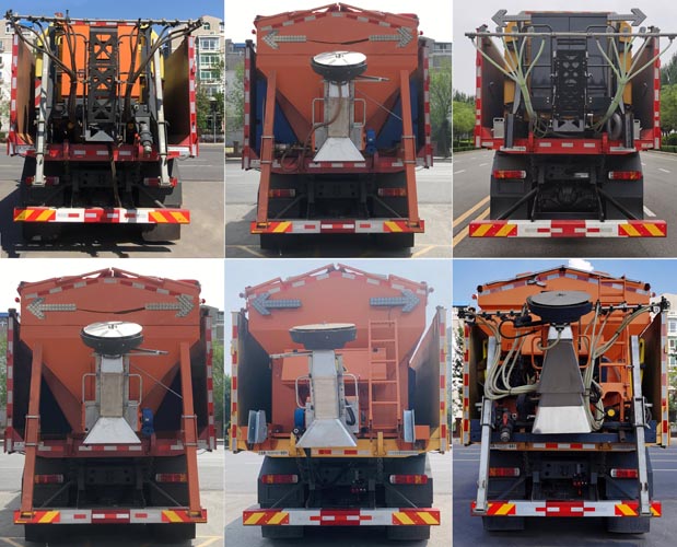 在上装配置上,该车整车外形尺寸为:10785,10985,11315,11515,11765,11965,9635,9835,9815,10015×2520×3450,3800,3550,3650(mm),用户需根据自我实际作业环境选择适合工况的车型。这款除雪车专用装置安装的是不小2吨的融雪撒布机,V型料仓采用碳钢制作,内部做三级防腐处理,结构简单,操作方便,使融雪剂自动落料,出料万全,无残留;