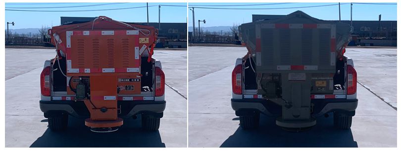 在上装配置上,该车整车外形尺寸为:6506,7331,5980,5560×1840×1850,1860(mm),用户需根据自我实际作业环境选择适合工况的车型。这款除雪车专用装置安装的是不小2吨的融雪撒布机,V型料仓采用碳钢制作,内部做三级防腐处理,结构简单,操作方便,使融雪剂自动落料,出料万全,无残留;