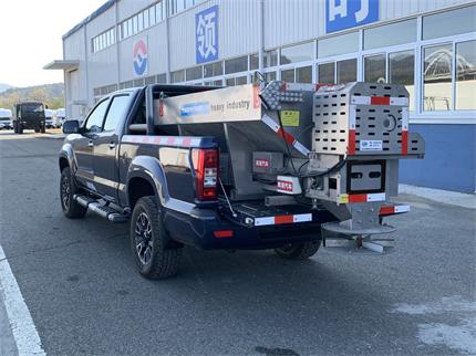 在上装配置上,该车整车外形尺寸为:7080,6640,6490,5560×1840×2030,1850(mm),用户需根据自我实际作业环境选择适合工况的车型。这款除雪车专用装置安装的是不小2吨的融雪撒布机,V型料仓采用碳钢制作,内部做三级防腐处理,结构简单,操作方便,使融雪剂自动落料,出料万全,无残留;