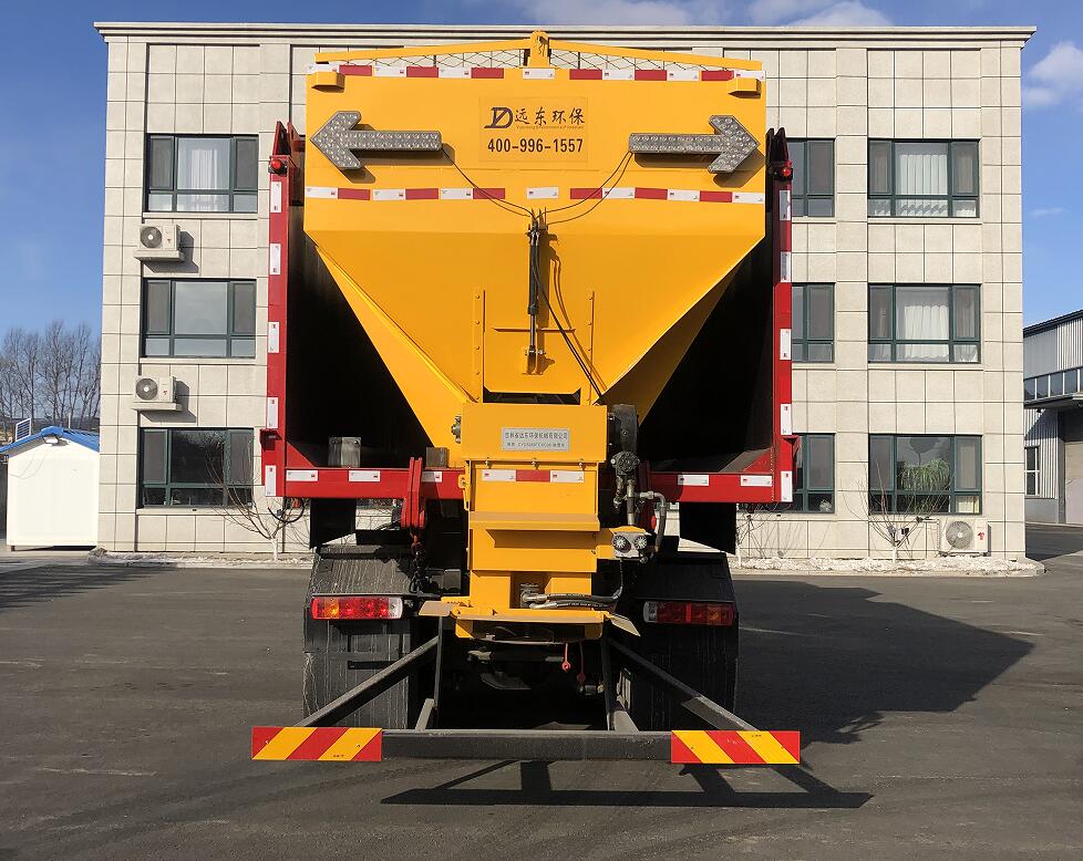 在上装配置上,该车整车外形尺寸为:10680×2550×3700(mm),用户需根据自我实际作业环境选择适合工况的车型。这款除雪车专用装置安装的是不小2吨的融雪撒布机,V型料仓采用碳钢制作,内部做三级防腐处理,结构简单,操作方便,使融雪剂自动落料,出料万全,无残留;