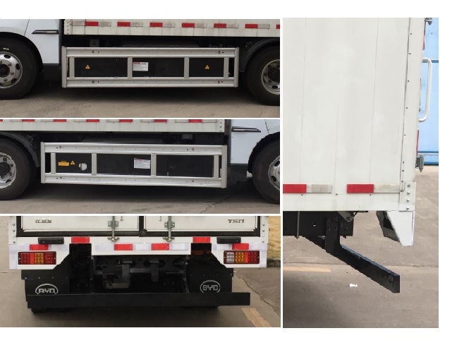 | 其它: | 厢体顶部封闭,不可开启,选装货厢,EV标识.防护装置的主要尺寸参数:侧后防护采用螺栓连接;后防护断面尺寸为40mm×110mm,离地高度为428mm,材料为铝材质;侧防护材料为铝材合金5052/6082;动力蓄电池种类:磷酸铁锂蓄电池,电池总成生产企业:汕尾比亚迪锂电池有限公司.驱动电机类型:永磁同步电机,额定功率55kW,峰值功率85kW,生产企业:合普动力股份有限公司.ABS系统生产企业:瑞立集团有限公司,ABS系统型号:RL-3550.车辆使用区域:可全国销售. | ||
