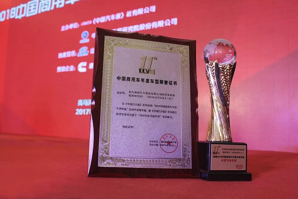 2017年12月5日,2018中国商用车年度车型评选颁奖典礼在北京举行,作为商用车界久负盛名的年度盛事,一直受到业内专家、车企以及用户的广泛关注。福田时代M3作为福田时代本次的参赛车型,历经连续3个月的专业评比,最终荣获“2018中国商用车年度节油车型” 大奖。