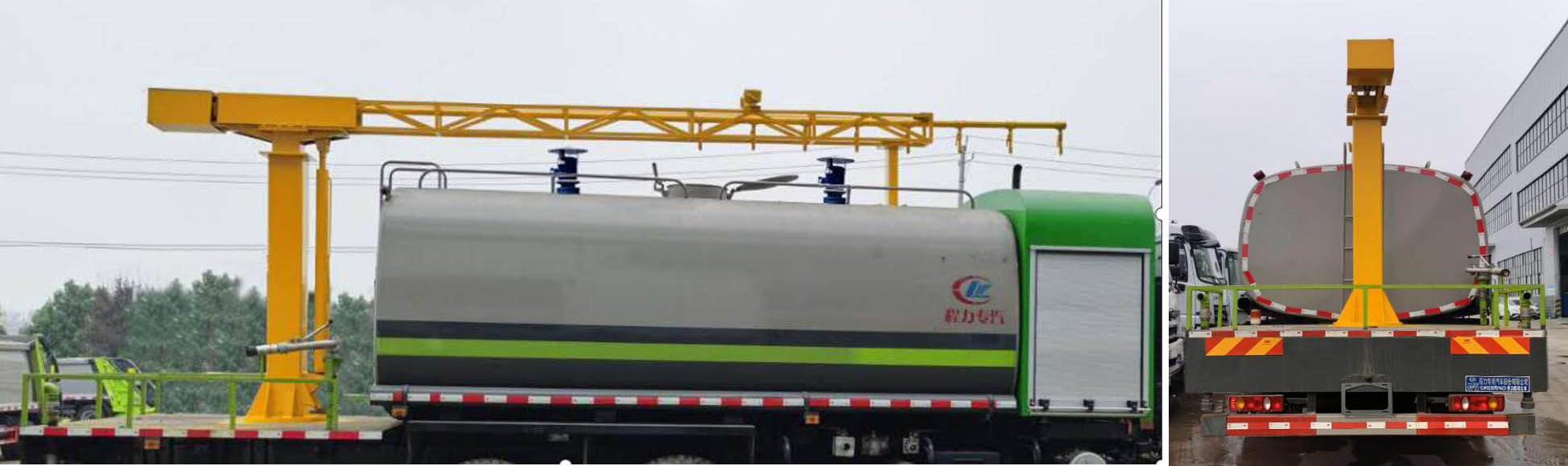 该车专用装置为抑尘雾炮,主要用于城市抑尘;整车长/轴距的对应关系为(mm):10180/4400+1350,11280/5500+1350;防护材料:左右侧面采用焊接连接,材质为Q235A碳钢,后下部防护采用螺栓连接,后部防护断面尺寸(mm):150×50,后部防护离地高度(mm):480.ABS控制器型号/生产企业:44600XXXX0/威伯科汽车控制系统(中国)有限公司,3550X-1010/东科克诺尔商用车制动系统(十堰)有限公司,CM4XL-4S/4M/广州瑞立科密汽车电子股份有限公司;选装后部喷杆抑尘装置. |