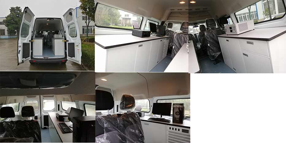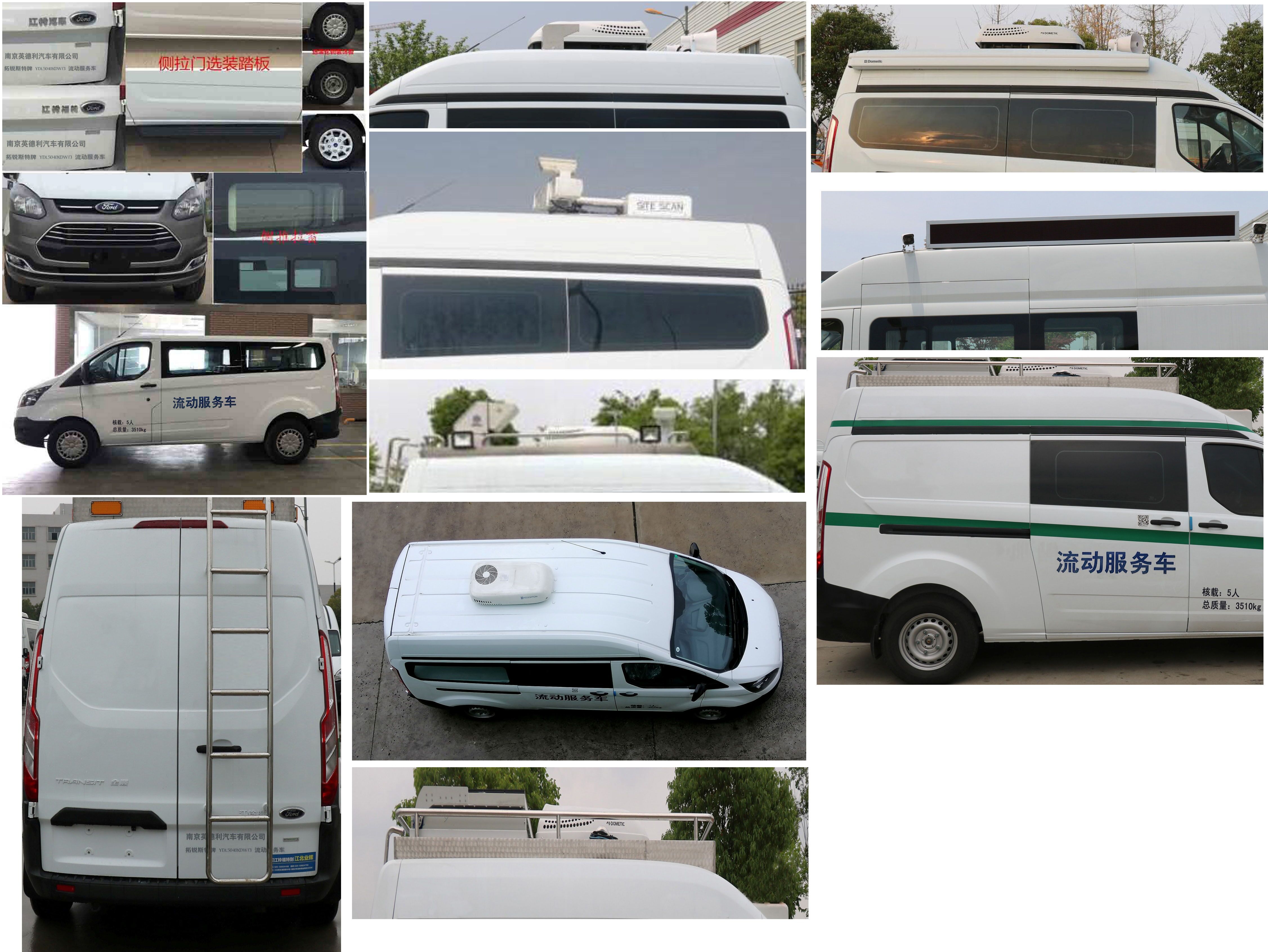 装备有服务台、工具柜、打印机、电脑及电源设备,选装顶置空调;随底盘选装前脸,轮辋,侧拉窗,尾部标识,选装低顶车身;车顶选装车顶平台、换气扇、防水音柱、喇叭、顶置空调、振镜、天线、遮阳篷、排烟管、广场照明灯、倒伏式LED屏、监控摄像机;选装前额凸台、前额凸台内嵌式显示屏、后部爬梯,侧、后部盲窗、市电小门;车顶无选装时整车高度为:低顶2061mm、中顶2407mm,选装换气扇、、喇叭、防水音柱时整车高度为:低顶2171mm、中顶2517mm,选装车顶平台及围栏、四周照明灯、车顶平台装喇叭时整车高度为:低顶2271mm、中顶2617mm,选装顶置空调时,整车高度为:低顶2301mm,中顶2647mm选装高杆照明灯时整车高度为:低顶2326mm、中顶2672mm,选装车顶平台带高杆照明灯、云台摄像机时整车高度为:低顶2417mm、中顶2770mm,选装高杆照明灯带监控摄像机、天线、振镜时整车高度为:低顶2532mm、中顶2867mm;ABS系统控制器型号:EV5051,ABS系统控制器生产企业:博世汽车部件(苏州)有限公司。发动机型号为DURATORQ4D206H,发动机最大净功率89kW。该车可选装ETC装置。 |