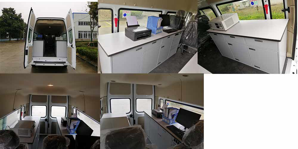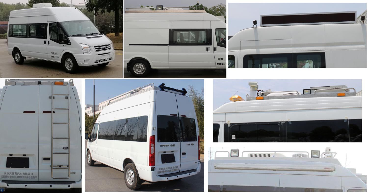 装备有流动服务车专用服务台、工具柜、电源设备及办公设备随原车选装机械踏板或电动踏板,选装普通款前大灯,选装中顶车高2360mm,选装号牌板支架,车门两侧选装不带英文装饰条,尾部选装外部标识,选装车身同色后视镜,选装车身同色门把手及钥匙孔,选装侧推拉窗;选装换气扇、喇叭、四周照明灯、显示屏、遮阳篷、前额凸台、车顶平台、倒伏式LED屏、高杆照明灯、云台摄像机,可不选装顶置空调;选装侧、后部部分或全部盲窗,车顶无选装时整车高度为(中顶:2360mm,高顶:2590mm), 选装换气扇高度为(中顶:2455mm,高顶:2685mm);选装车顶平台、倒伏式LED屏高度为(中顶:2530mm,高顶:2760mm),选装喇叭、四周照明灯高度为(中顶:2565mm,高顶:2795mm),选装顶置空调、高杆照明灯高度为(中顶:2600mm,高顶:2830mm),选装云台摄像机高度为(中顶:2805mm,高顶:3045mm),选装车顶平台装云台摄像机高度为(中顶:2905mm,高顶:3135mm);ABS系统控制器型号:EV5051,ABS系统控制器生产企业:博世汽车部件(苏州)有限公司。发动机型号为DURATORQ4D226H,发动机最大净功率101kW。该车可选装ETC装置。 |