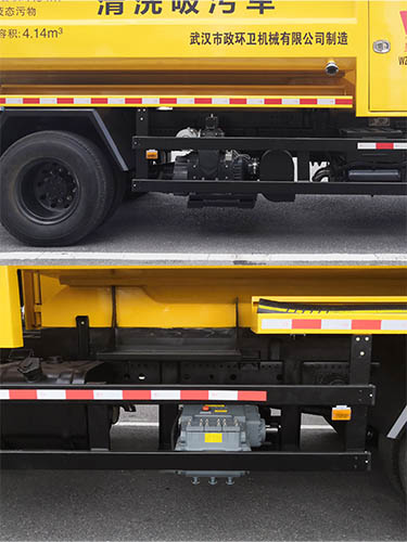 吸污罐罐体外形尺寸(直径×直段长)(单位:毫米):1500×3384;吸污罐有效容积为7.84立方米,介质为液态污物,密度:950千克/立方米。清水罐截面为多边形组成,截面积为0.5914平方米,长度为3500毫米,清水罐的有效容积为4.14立方米,介质为水,密度是1000千克/立方米。清水罐和污水罐不能同时满载。侧防护与后防护所用材料材质均为Q235A,侧防护与副车架螺栓连接,后防护与大梁焊接固定,后防护断面尺寸为120毫米×50毫米,离地高度为420毫米。仅采用底盘轴距为4500毫米。ABS型号:3631010-C2000、4460046440;生产厂家:东科克诺尔商用车制动系统(十堰)有限公司、威伯科汽车控制系统(中国)有限公司。随底盘选装驾驶室。 |