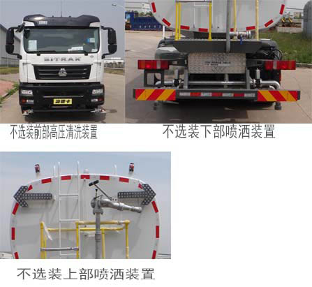 该车装有水路系统,清洗工作装置,控制系统,用于路面洒水降尘作业.介质为水, 密度:1000千克/立方米。罐体外形尺寸(长轴×短轴×长度)(mm):2400×1410×5490.罐体有效容积13.5立方米;加装前清洗装置时,前伸850mm,整车长10440mm,对应接近角为10°,整备质量11940kg;配置基本型时,整车长9590mm,对应接近角为16°;整备质量11740kg;侧面防护装置所用材料材质:铝合金,连接方式为螺栓连接;后部防护装置所用材料材质:Q235B,连接方式为螺栓连接,断面尺寸为120×50,离地高度为500mm.ABS系统控制器生产企业/型号为威伯科(上海)管理有限公司/4460046300;选装EBS,EBS系统控制器生产企业/型号为威伯科(上海)管理有限公司/EBS3。该车选用底盘4300+1350mm轴距.可不选装前清洗装置,选装后部喷洒装置位置。 |