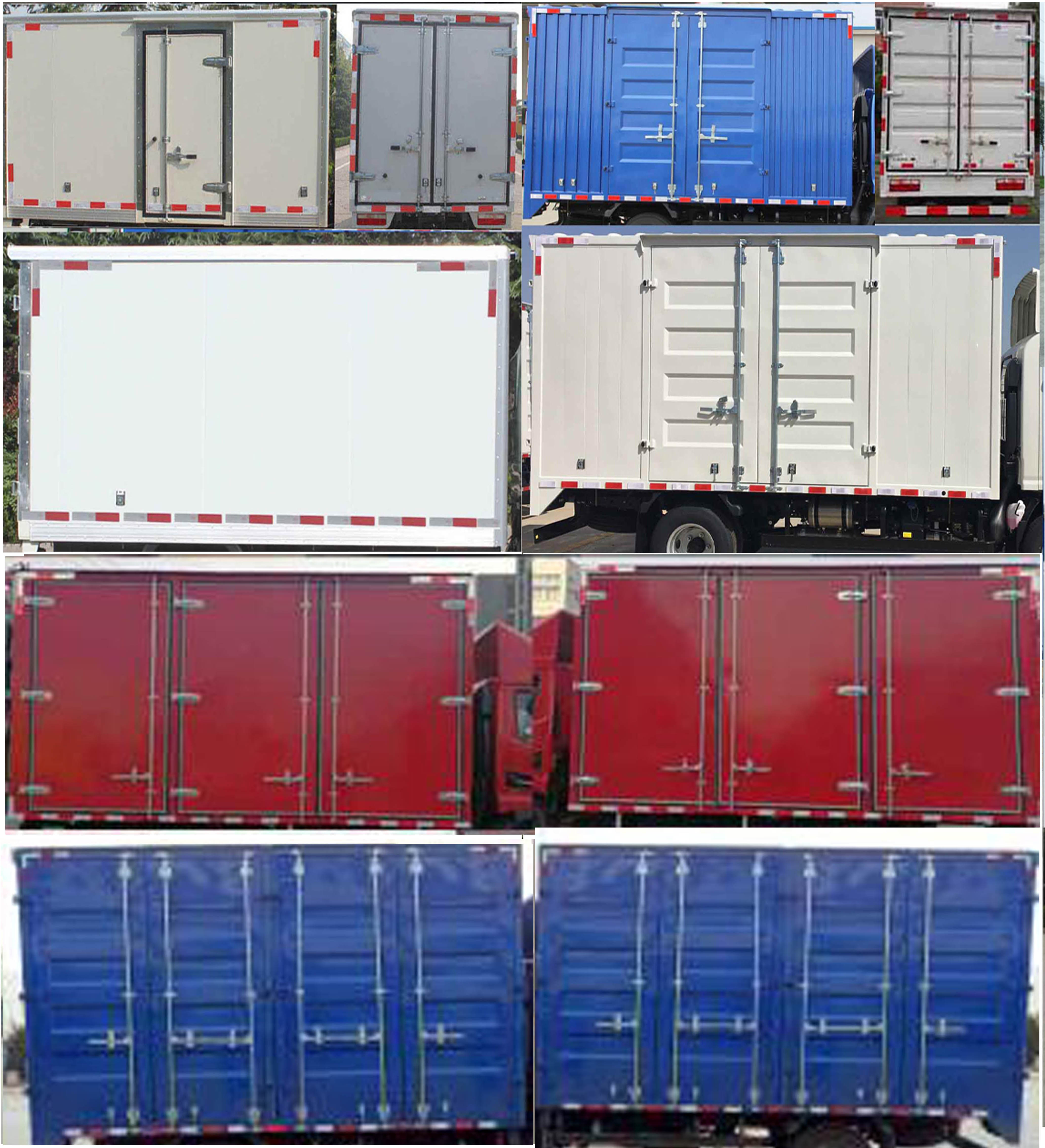 1.侧面及后下部防护装置材料为Q235A,连接方式为螺栓连接,后部防护装置断面尺寸(长×宽):120mm×60mm,离地高度440mm;2.发动机Q28-130E60、D25TCIF1、HFC4DB3-2E、D30TCIF2、WP2.3NQ130E61、HFC4DE2-2E对应的油耗申报值 (L/100km)为11.4、11.4、11.4、11.4、11.4、11.4;3.ABS型号/厂家为VIE ABS-Ⅱ/浙江万安科技股份有限公司;3.选装不带导流罩;4.选装侧面防护装置,材料为Q235A,连接方式为螺栓连接;;5.选装右侧四开门、双开门、单开门货厢以及不开门货厢;选装右侧、选装左右侧双开门、三开门、四开门货厢;货厢材料可选用铝平板,彩钢板,瓦楞板,铁平板;6.选装货箱尾部三开门状态;7.选装改前围面板,进气格栅,前保险杠,组合灯具,前雾灯,后视镜的驾驶室;8.选装侧后防护,防护装置材料为Al-6061(铝合金),连接方式为螺栓连接,后部防护装置断面尺寸(长×宽):150mm×55mm,离地高度为450mm,选装不同风格铝合金侧防护;9.选装侧面及后下部防护装置材料为Q235,连接方式为螺栓连接,后部防护装置断面尺寸(长×宽):120mm×60mm,离地高度490mm;10.选装后位灯,制动灯,后雾灯,后转向灯,后回复反射器;11.选装不带备胎状态;12.可选装液压尾板,尾板收起状态的水平长度为280mm,当选装液压尾板时后部防护装置材料为510L,后部防护装置的断面尺寸(圆形)为:Φ115mm,离地高度为455/480mm,尾板质量为350Kg;12.随底盘选装排半驾驶室 |