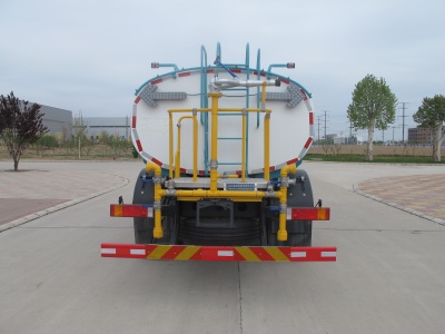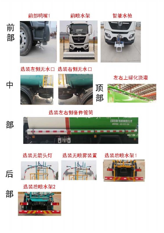 ①该车用于城镇环境清洗及清洁作业,主要专用装置为水罐、水路及作业装置,运输介质:水,密度:1000千克/立方米,有效容积10.6立方米,罐体尺寸为(长×长轴×短轴)(mm):4600×2350×1400②仅选用4500mm轴距底盘;③随底盘选装驾驶室外观,前悬为1430mm时,整车长度为8030mm,前悬为1400mm时,整车长度为8000mm;④侧面防护装置材料为铝合金,与车辆的连接方式为螺栓连接,后下部防护装置材料为Q235,与车辆的连接方式为焊接连接;后下部防护断面尺寸为130mm×50mm,下边缘离地高度为490mm;⑤该车可选装智能水枪,前伸为535mm,对应整车长度为8565(8535)mm,该系选装对于整车重量变化可忽略不计;⑥该车可选装前喷水架,前伸为945mm,对应整车长度为8975(8945)mm,该系选装对于整车重量变化可忽略不计;⑦该车可选装前鸭嘴、罐体尾部无水口、顶部上绿化浇灌、左右侧备件管筒、后部洒水架、无上喷雾、无箭头灯等,该系选装对于整车尺寸,重量变化可忽略不计;⑧随底盘ABS型号/生产厂家:3631010-C2000/东科克诺尔商用车制动系统(十堰)有限公司,ABS 8/东科克诺尔商用车制动系统(十堰)有限公司, 4460046450/威伯科汽车控制系统(中国)有限公司。⑨随底盘选装前下视镜、选装不同结构的车门裙板、选装驾驶室卧铺侧窗装饰板;⑩选装清洗装置。 |
