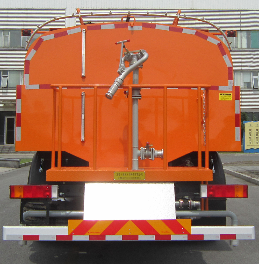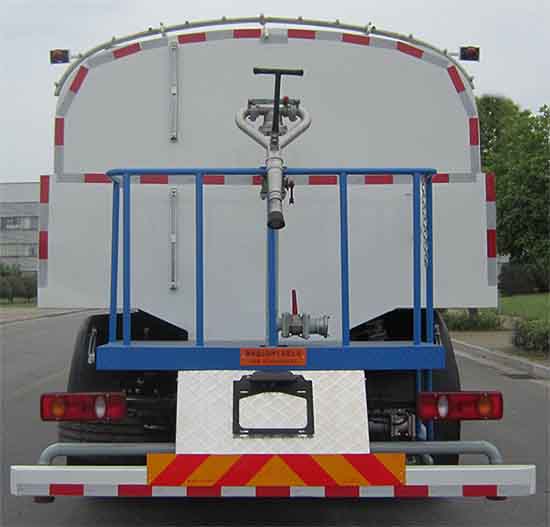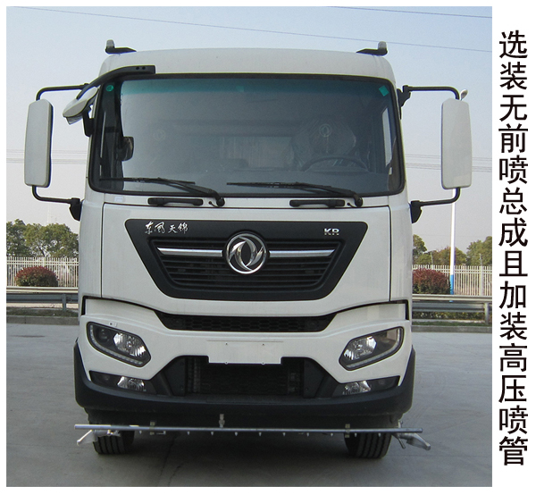 具有罐体和后平台工作装置及高压清洗功能,罐体有效容积9.3立方米,介质为水.罐体外形尺寸尺寸(mm):4000×2300×1400.可选装无前喷总成且加装高压喷管,仅选用4500mm轴距.随底盘选装高度不同的驾驶室,驾驶室顶部装饰灯,前雾灯,驾驶室前面罩,前保险杠及前部灯具,后视镜,驾驶室前脸扰流罩,后尾部组合灯;选装情况-整车长度mm-前悬mm-接近角--整备质量kg--额定载质量kg对应关系:基本型-9550--2670--8--8935--8870,选装无前喷架,加装高压前喷管--8280--1400--17--8715--9090.左右侧防护装置采用铝型材,用螺栓螺母固定于固定车架左右纵梁上;后防护装置采用120×80×5的空心型钢(Q235A)与厚为10mm的钢板(Q345B)支架焊接而成,固定于底盘大梁两侧,离地高度为480mm.安装具有卫星定位功能的行驶记录仪.安装ABS,ABS型号/生产厂家:3631010-C2000/东科克诺尔商用车制动系统(十堰)有限公司,ABS 8/东科克诺尔商用车制动系统(十堰)有限公司, 4460046450/威伯科汽车控制系统(中国)有限公司.该车型可选装ETC车载装置. |