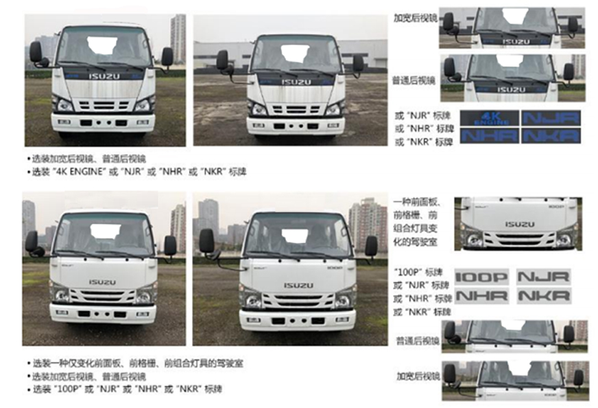 1、选装前面板、前格栅、前组合灯具的驾驶室;选装后视镜款式;选装前部标牌“4K ENGING/NJR/NHR/NKR/ 100P”。2、该车装ABS,ABS及控制器型号为:装液压制动系统时,ABS及其控制器型号/生产企业对应关系为:APG3550500A/浙江亚太机电股份有限公司,CM4YL/广州瑞立科密汽车电子股份有限公司;装气压制动系统时,ABS及其控制器型号/生产企业对应关系为:CM4XL-4S/4M/广州瑞立科密汽车电子股份有限公司;3、侧防护由专用装置代替,故豁免;后防护由专用装置代替,最下端离地高为210毫米。该车专用作业装置有水箱和清扫装置,功能主要用于城区道路、高速公路街道清扫等。 |