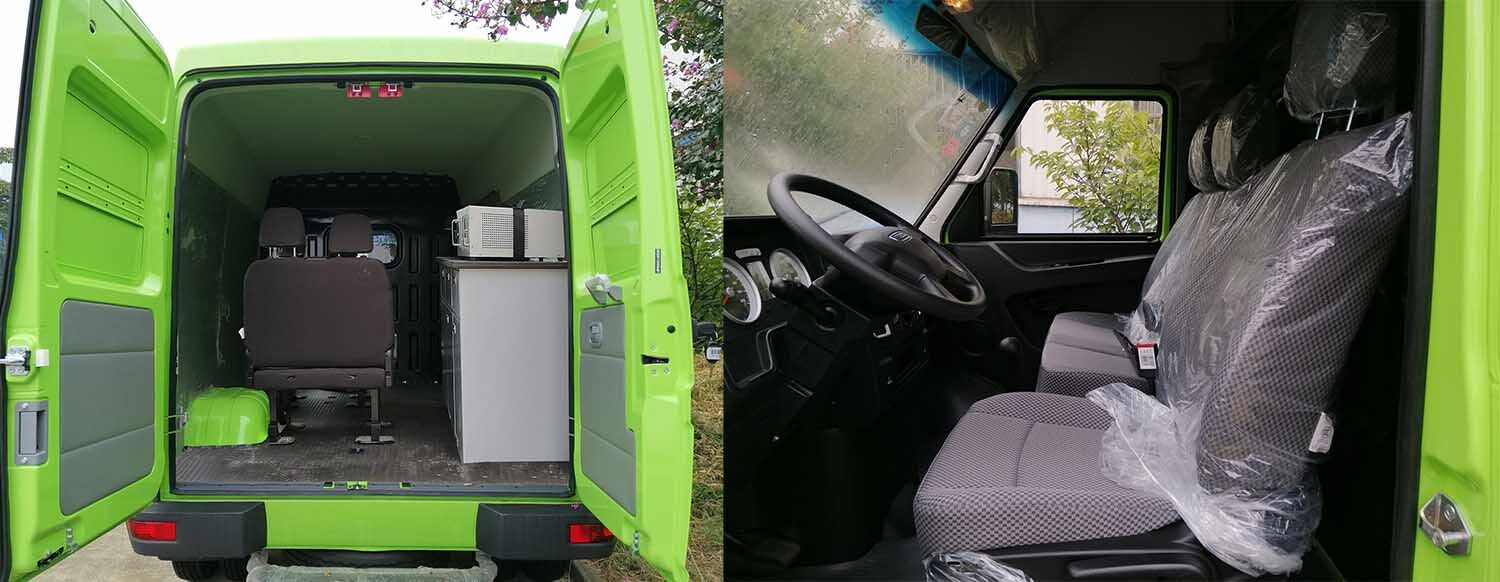拓锐斯特牌依维柯国五流动服务车在外观时尚霸气造型圆润流畅,可有效降低风阻系数,整车外形尺寸为4875×2000×2570,2770(mm),厢体采用玻璃钢复合车身结构及阻燃保温材料,做工精细;房厢内部配置齐全。