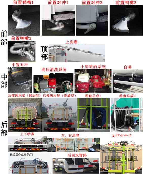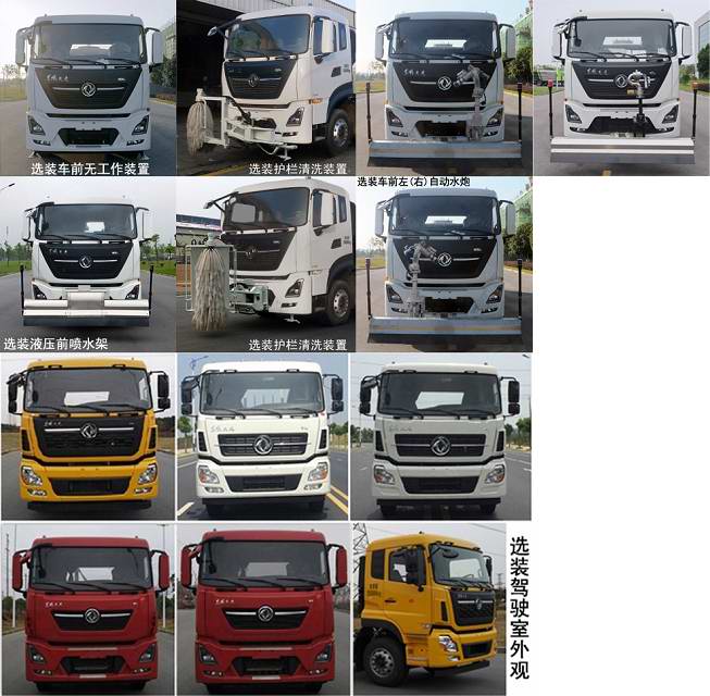 该车装有水罐、水路系统、清洗工作装置、作业平台、控制系统,用于清洗作业;采用底盘4350+1350mm轴距;罐体外形尺寸(长轴×短轴×长度)(mm):2400×1420×5500.罐体有效容积13.5立方米;选装配置方式有如下几种情况:A,基本型(驾驶室前无工作装置);B,配装气控喷水架;C,配装液压喷水架;D,配装护栏清洗装置;随底盘选装驾驶室外观,前悬为1480mm或1500mm,选装A时,整车长度为9610mm或9630mm,后悬2430mm;选装B时,整车长度为10515mm或10535mm,后悬2430mm;前伸为905mm,选装C时,整车长度为10560mm或10580mm,后悬2430mm;前伸为950mm;选装D时,整车长度为10495mm或10515mm,后悬2430mm,前伸为885mm;侧防护装置材料为铝合金,连接方式为螺栓连接;后防护装置材料为Q345A,与车辆连接方式为螺栓连接;后部防护装置的断面尺寸为240×65mm,离地高度为460mm.该车可选装前左(右)自动水炮、鸭嘴、对冲、上浇灌、高压清洗系统、小型喷洒系统、自吸、后部洒水架(保洁型、浇灌型)、卷盘、上下喷雾、左右浇灌、后作业指示灯2、后作业平台、后回水管路;该系列选装对于整车尺寸,重量变化可忽略不计;随底盘装有ABS,ABS型号/生产厂家:3631010-C2000/东科克诺尔商用车制动系统(十堰)有限公司,ABS 8/东科克诺尔商用车制动系统(十堰)有限公司,4460046450/威伯科汽车控制系统(中国)有限公司. |