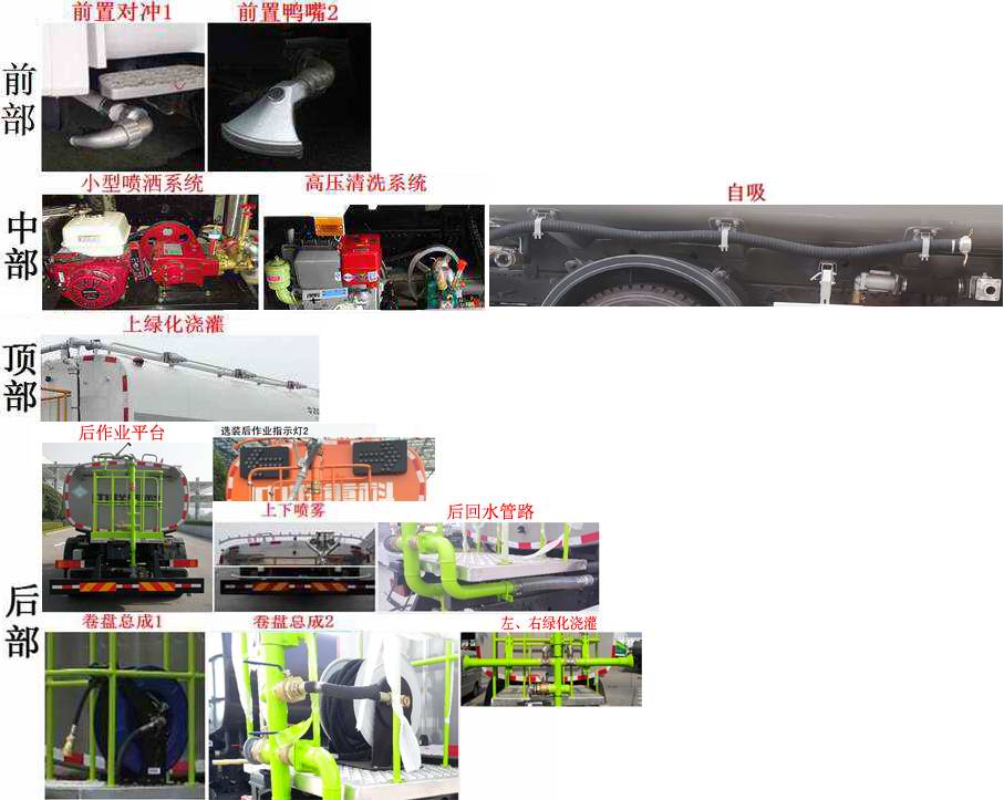 该车选用4500mm底盘轴距;该车装有水罐、水路系统、清洗工作装置、控制系统,用于清洗作业;罐体外形尺寸(长轴×短轴×长度)(mm):2400×1420×4200.罐体有效容积9.83立方米;该车标配时,随底盘选装驾驶室外观,前悬为1430mm时,整车长度为8345mm;前悬为1400mm时,整车长度为8315mm;该车选装前自动水炮时,前伸737mm,随底盘选装驾驶室外观,前悬为1430mm时,整车长度为9082mm;前悬为1400mm时,整车长度为9052mm.侧面防护装置材料为铝合金,连接方式为螺栓连接,后防护装置材料为Q345A,与车辆连接方式为螺栓连接;后部防护装置的断面尺寸为240×65mm,离地高度为490mm;该车可选装对冲、鸭嘴、小型喷洒系统、高压清洗系统、自吸、上绿化浇灌、后作业平台、后作业指示灯2、上下喷雾、后回水管路、卷盘、左(右)绿化浇灌,该系列选装对于整车尺寸、重量变化可忽略不计;随底盘装有ABS,型号/生产厂家:3631010-C2000/东科克诺尔商用车制动系统(十堰)有限公司,ABS-E 4S/4M/生产厂为威伯科汽车控制系统(中国)有限公司. |