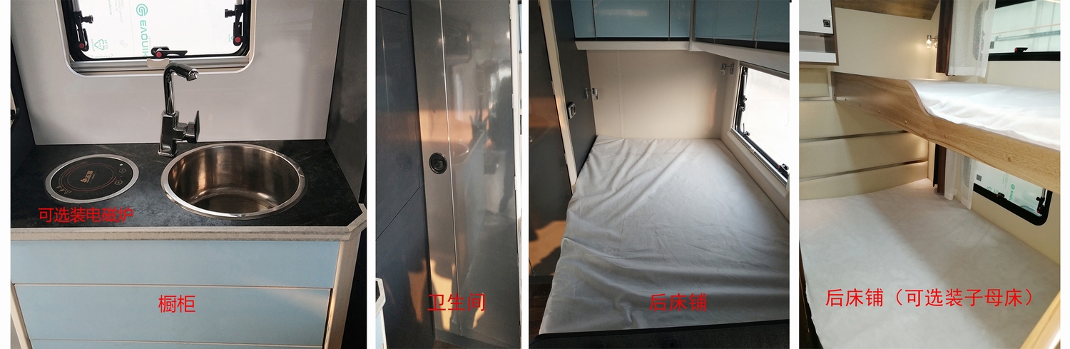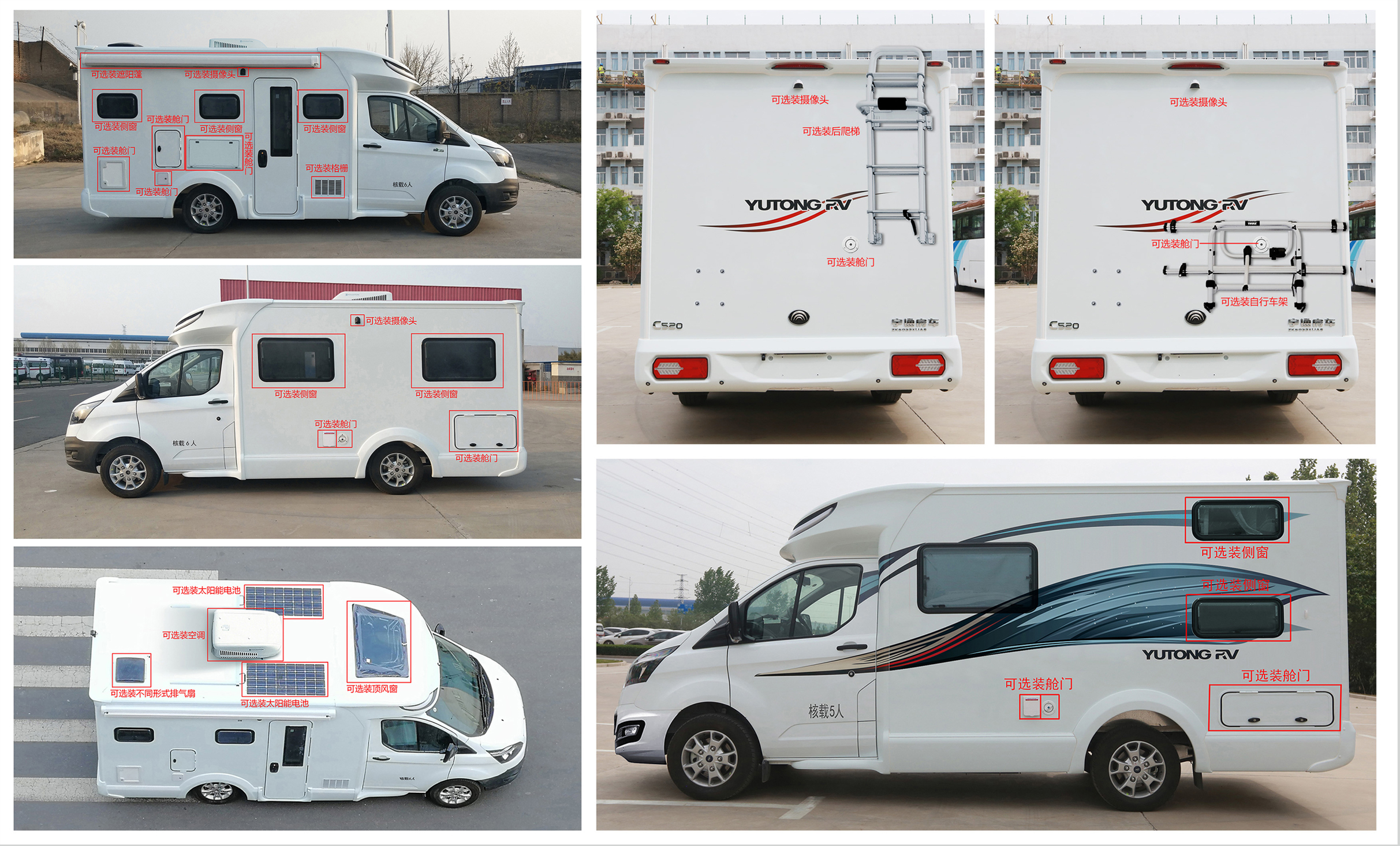 1.该车装备有炊事设施、床、卫生间等设备,用于旅行宿营;2.安装中等配置时整备质量为2892kg,对应额定载客最大为6人,安装高等配置时整备质量为2960kg,对应额定载客最大为5人;3.选装顶置空调对应整车高度为2830mm,可取消顶置空调,选装不同形式换气扇对应车高为2599mm或2670mm;4.右侧选装遮阳蓬对应宽度为2190mm,可取消遮阳蓬,对应车宽为2130mm;5.车身两侧可选装不同形式侧窗、侧舱门、摄像头,可选装不同形式轮罩;6.可随底盘选装不同形式的前脸造型、轮毂;7.车顶可选装顶风窗、空调、太阳能电池;8.车辆后部可选装摄像头、后舱门、自行车架、后爬梯;9.车辆右侧可选装不同形式乘客门;10.车内可选装电磁炉,可选装不同形式床铺;11.ABS生产企业:博世汽车部件(苏州)有限公司,ABS型号:EV5051;12.发动机最大净功率147kW;13.该车以裙边结构作为侧、后防护,侧防护下边缘离地高度325mm,后防护下边缘离地高度390mm. |