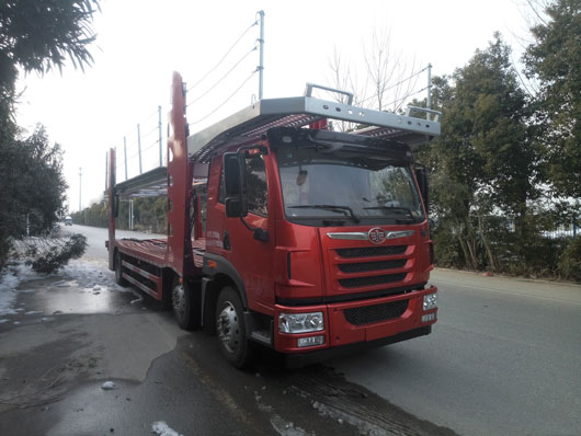 天顺牌解放小三轴国五车辆运输车轿运车在从前面看,驾驶室没有什么变化,外形尺寸为11260,11470×2550×4000(mm),在车长和车宽上都做了调整,安全性大大提高了,整车的上户吨位为9505,9570(kg),总质量为21500(kg),上装配备多个液压油缸,材料都是用的低合金高强度结构钢制作而成,强度高,焊接性好,耐腐蚀,可以有效延长轿运车使用寿命。