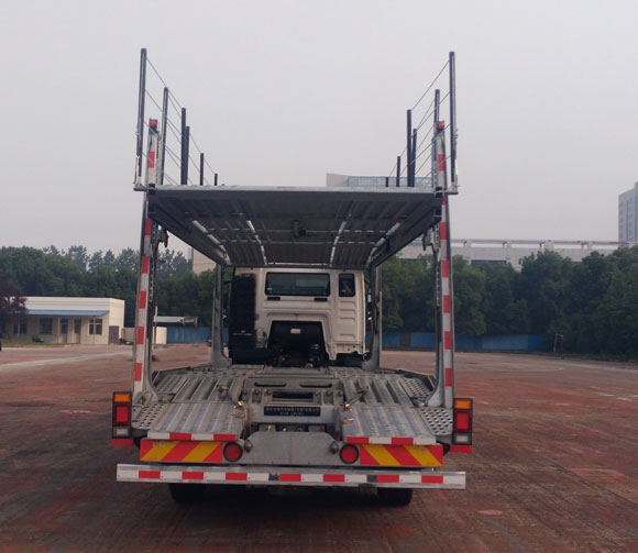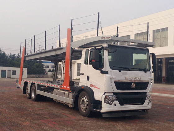 劳尔牌重汽豪沃后双桥国五车辆运输车轿运车在从前面看,驾驶室没有什么变化,外形尺寸为10960×2550×4000(mm),在车长和车宽上都做了调整,安全性大大提高了,整车的上户吨位为12805,12870(kg),总质量为25000(kg),上装配备多个液压油缸,材料都是用的低合金高强度结构钢制作而成,强度高,焊接性好,耐腐蚀,可以有效延长轿运车使用寿命。