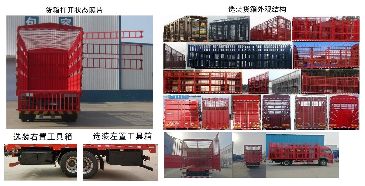 该车随底盘选装半高顶或高顶驾驶室。可不选装导流罩。选装高位保险杠。选装保险杠外观。选装踏步。选装昼间行驶灯。选装消声器。该车可选装油浴式空滤器。选装右置油箱。选装左置电瓶箱。选装大油箱。选装双腔油箱。选装车道偏离报警和车辆前向碰撞预警系统。选装四方位影像系统。选装前拖钩。可选装货箱外观结构。选装工具箱。仅选装二类底盘的4500,4700,5100轴距。该车装MC05H.20-60、WP4.6NQ220E61发动机的最大净功率为144kW、158kW,VIN前八位为LZZPBCHF(轴距4500,4700)或LZZPBCHG(轴距5100);装MC05H.23-60、MC05H.25-60、MC07.25-60、WP6H245E61发动机的最大净功率为163kW、177kW、185kW、175kW,VIN前八位为LZZPBCKF(轴距4500,4700)或LZZPBCKG(轴距5100);装MC07.27-60、WP6H270E61发动机的最大净功率为199kW、194kW,VIN前八位为LZZPBCMF(轴距4500,4700)或LZZPBCMG(轴距5100)。驾驶室准乘人数与额定载质量参数一一对应。车长与前悬、轴距、后悬、货箱内长尺寸对应关系如下(尺寸单位:mm):8120=1550+4500+2070,货箱内长5800;8320=1550+4500+2270,货箱内长5800;8500=1550+4700+2250,货箱内长6200;8720=1550+4700+2470,货箱内长6200;9000=1550+5100+2350,货箱内长6750。车箱底板到栅栏顶部高度为2500mm或2550mm或2600mm。该车装MC05H.20-60、MC05H.23-60、MC05H.25-60、MC07.25-60、MC07.27-60、WP4.6NQ220E61、WP6H245E61、WP6H270E61发动机对应的油耗申报值均为26.5L/100km。侧面防护装置所用材料材质为Q235A,连接方式为螺栓连接;后部防护装置所用材料材质为Q235A,连接方式为螺栓连接+焊接,断面尺寸为120mm×120mm,离地高度为480mm。ABS系统型号为446 004 6300,生产企业为威伯科汽车控制系统(中国)有限公司。该车可选装限速装置,限速89km/h。安装具有卫星定位功能的行驶记录仪。选装踏步和侧翼子板配色。选装新款面罩。 |