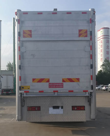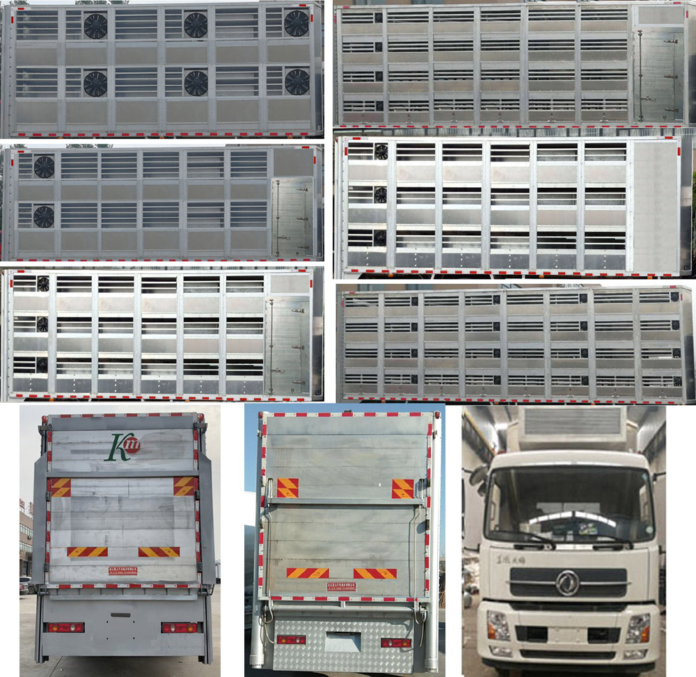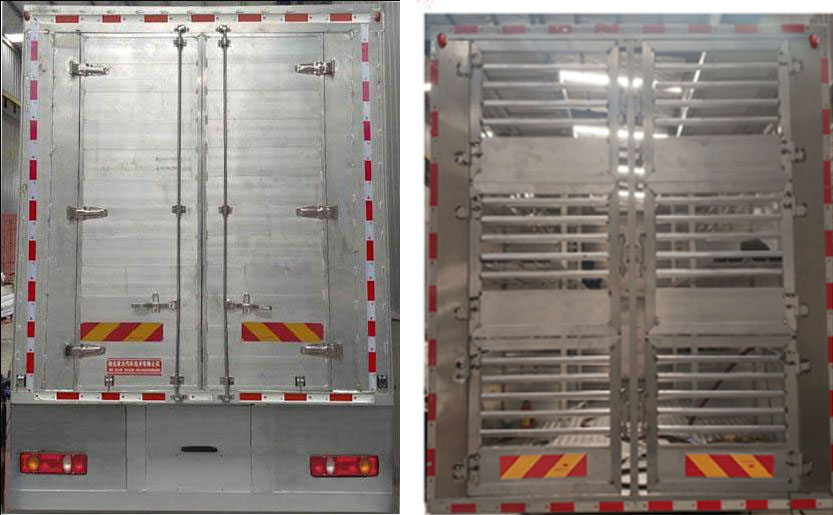 扩展箱体后门结构;随底盘选装驾驶室;选装两层、三层、四层仓栅结构;选装箱体前部带单开门和封板结构;选装前部带空调结构;选装后部液压围板结构,后部装有升降机和液压尾板,液压尾板收起状态的水平长度为280mm,液压尾板重量550kg;选装后部不带升降机和液压尾板结构,即普通双开门结构时,整备质量为8400kg;整车长/货箱内长/轴距/后悬对应关系(mm):9000/6750/5000/2570,9000/6400/5000/2570,8600/6150/4700/2470;仅采用5000mm和4700mm轴距;整备质量/载质量对应关系(kg):8850/8955,8400/9405;货箱底板到仓栅顶部的高度为2600,2310mm,箱体两侧开窗,中间有隔栏,侧防护材质:矩形铝合金型材6061-T5,连接方式螺栓连接;后防护材料Q235B,焊接连接,与车辆结构为一体,后防护断面尺寸:120×80mm,下边缘离地高度430mm;ABS型号:3631010-C2000;生产厂家:东科克诺尔商用车制动系统(十堰)有限公司;安装带有卫星定位功能的行驶记录仪;采用的发动机与油耗值(L/100Km)对应关系为: ISD270 50/29.0,ISD210 50/29.0,ISD180 50/29.0,EQH180-53/29.0,ISB180 50/29.0,ISB210 50/29.1;该车专用装置主要由箱体组成,用于畜禽运输. |