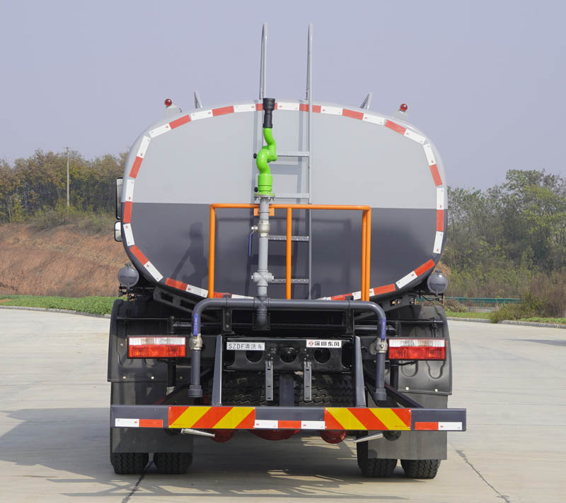 东风牌D9国六11.49方路面清洗车车身喷漆采用白蓝相配,寓意蓝天白云,保卫环境整洁的意思;整车外形尺寸为8130×2500×3300(mm),罐体容量大,车辆额定载质量达到10980,10915(Kg),保证了运输的水容量,改装配置上,加装有60米的耐高压钢丝清洗高压管,方便近距离作业;配上金属喷漆,提高车辆档次,确保罐体无掉漆,延长使用寿命,同时整车造型美观,比例协调。