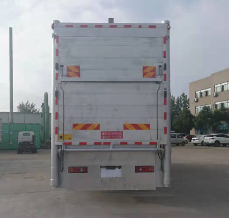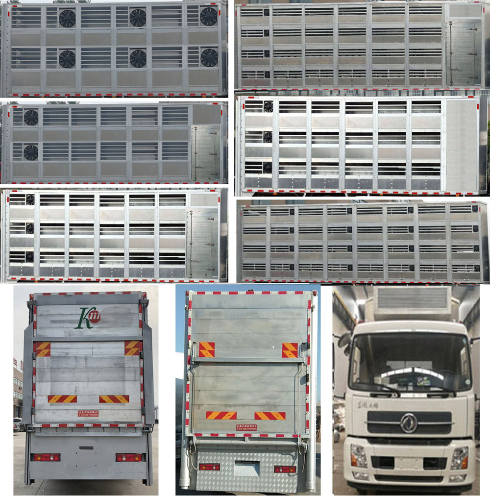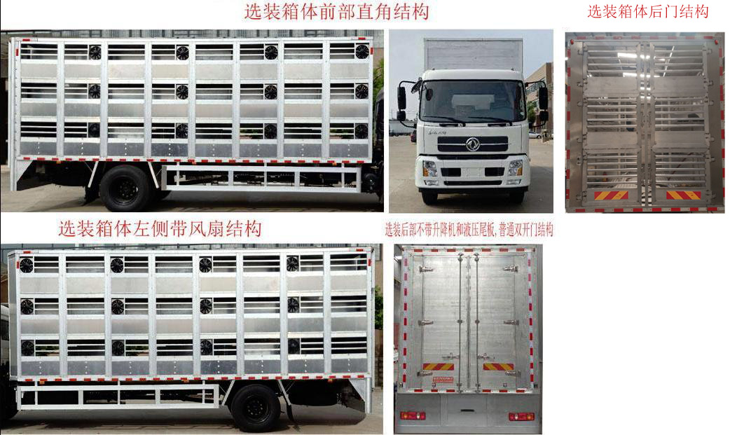 选装箱体后门结构;随底盘选装驾驶室;选装两层、三层、四层仓栅结构,选装箱体前部带单开门结构和封板结构,选装前部带空调结构;选装后部液压尾板结构,选装箱体左侧带风扇结构,选装箱体前部直角结构;后部装有升降机和液压尾板,液压尾板收起状态的水平长度为280mm,液压尾板重量550kg;选装后部不带升降机和液压尾板,普通双开门结构;仅采用5600mm轴距;货箱底板到仓栅顶部的高度为2600,2310mm,箱体两侧开窗,中间有隔栏;侧防护材质:矩形铝合金型材6061-T5,连接方式螺栓连接;后防护材料Q235B,焊接连接,与车辆结构为一体,后防护断面尺寸:120×80mm,下边缘离地高度430mm;ABS型号:3631010-C2000,4460046440,生产厂家:东科克诺尔商用车制动系统(十堰)有限公司,威伯科汽车控制系统(中国)有限公司;安装带有卫星定位功能的行驶记录仪;采用的发动机与油耗值(L/100Km)对应关系为: ISD210 50/29.0,ISD180 50/29.0,EQH180-53/29.0,ISB180 50/29.0,ISB210 50/29.1;该车专用装置由箱体、液压系统等机构组成,主要用于畜禽运输. |