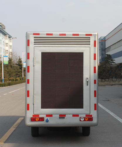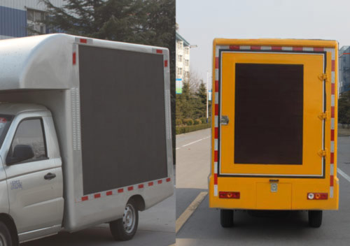 选装新前围;该车是用于广告宣传和科普宣传的专用车.车厢上部封闭不可开启.该车前部选装LED条屏或显示屏,左侧为LED显示屏,选装滚轴装置,右侧为滚轴装置,选装LED显示屏;后部为LED显示屏及通风口;LED显示屏为彩色屏.车辆颜色可选,文字喷涂位置可变化.车辆带OBD.两侧均可选装:LED屏,滚轴灯箱;后部可选装后开门,通风口可取消;选装不同风格的货箱型式,ABS型号为YF9,生产企业为武汉元丰汽车电控系统有限公司. |