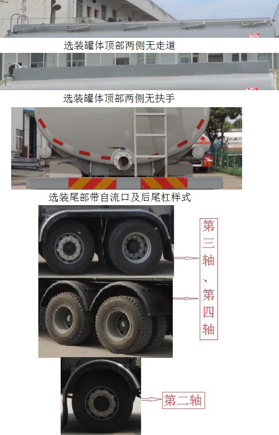 该车型为非危化品运输车,罐体有效容积:25.3立方米,介质:洗井泡沫液,整车长度/轴距/前悬/后悬/罐体尺寸对应关系分别为(mm):11800/1800+4575+1400/1525/2500/8800×2500×1720; 11200/1800+3975+1400/1525/2500/8300×2350×1650;随底盘选装驾驶室,选装尾部带自流口及上尾杠样式,选装罐体顶部两侧无走道有扶手及无走道无扶手,选装挡泥板样式;侧,后防护装置材料材质:Q235B,侧,后防护均用螺栓连接,后部防护装置断面尺寸(宽×高)80×150(mm),后部防护离地高度:500mm.安装具有卫星定位功能的行驶记录仪.ABS系统生产厂家及型号为:广州市科密汽车制动技术开发有限公司, 西安正昌电子有限责任公司, 浙江万安科技股份有限公司;ABS系统型号:CM4XL-4S/4K(4S/4M),ZQFB-V,VIE ABS-Ⅱ. |