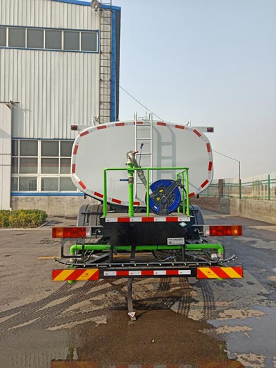 车身喷漆采用白蓝相配,寓意蓝天白云,保卫环境整洁的意思;整车外形尺寸为9165,9195×2470×2960(mm),罐体容量大,车辆额定载质量达到8570,8505(Kg),保证了运输的水容量,改装配置上,加装有60米的耐高压钢丝清洗高压管,方便近距离作业;配上金属喷漆,提高车辆档次,确保罐体无掉漆,延长使用寿命,同时整车造型美观,比例协调。