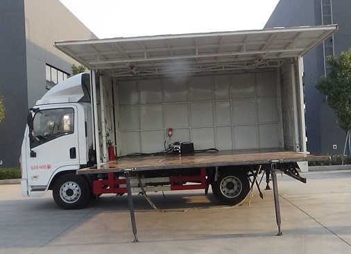 该车是进行舞台文艺表演的专用车辆;专用装置:厢体,折叠式舞台.侧面防护材料:Q235A碳钢.连接方式:左右侧面采用焊接连接.后防护装置材料:Q235A碳钢.连接方式:采用螺栓连接.后部防护断面尺寸(mm):100×50,后部防护离地高度(mm):380.ABS系统生产厂家及型号为:广州瑞立科密汽车电子股份有限公司(型号:CM4XL-4S/4M);威伯科汽车控制系统(中国)有限公司(型号:ABS-E 4S/4M). |