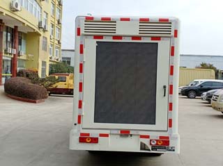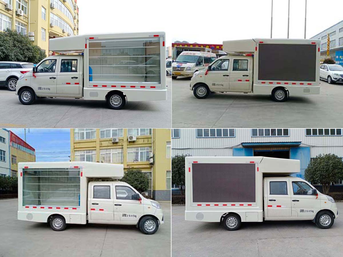 富园牌HFY5033XXCB6型宣传车整车的外形尺寸为5400×1760×2640(mm),车身颜色搭配LED显示屏的颜色再加上广告的炫彩,非常吸引人的眼球。箱体左右后三面都可选装LED显示屏,屏幕的清晰度随您挑选。该显示屏显示的色彩与播放源的色彩保持高度一致,显示出来的图像真实感极强。