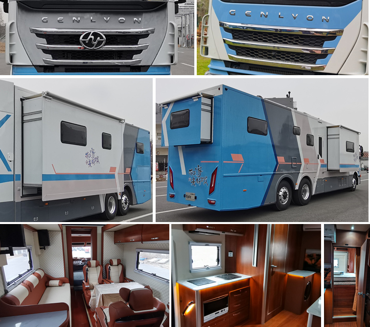 大通牌红岩后双桥国五黄牌旅居车在外观时尚霸气造型圆润流畅,可有效降低风阻系数,整车外形尺寸为11980×2550×3850(mm),房厢采用玻璃钢复合车身结构及阻燃保温材料,做工精细;房厢内部配置齐全,床,洗手间,厨房,冰箱,,储物仓,暖气设备,灭火器等等。