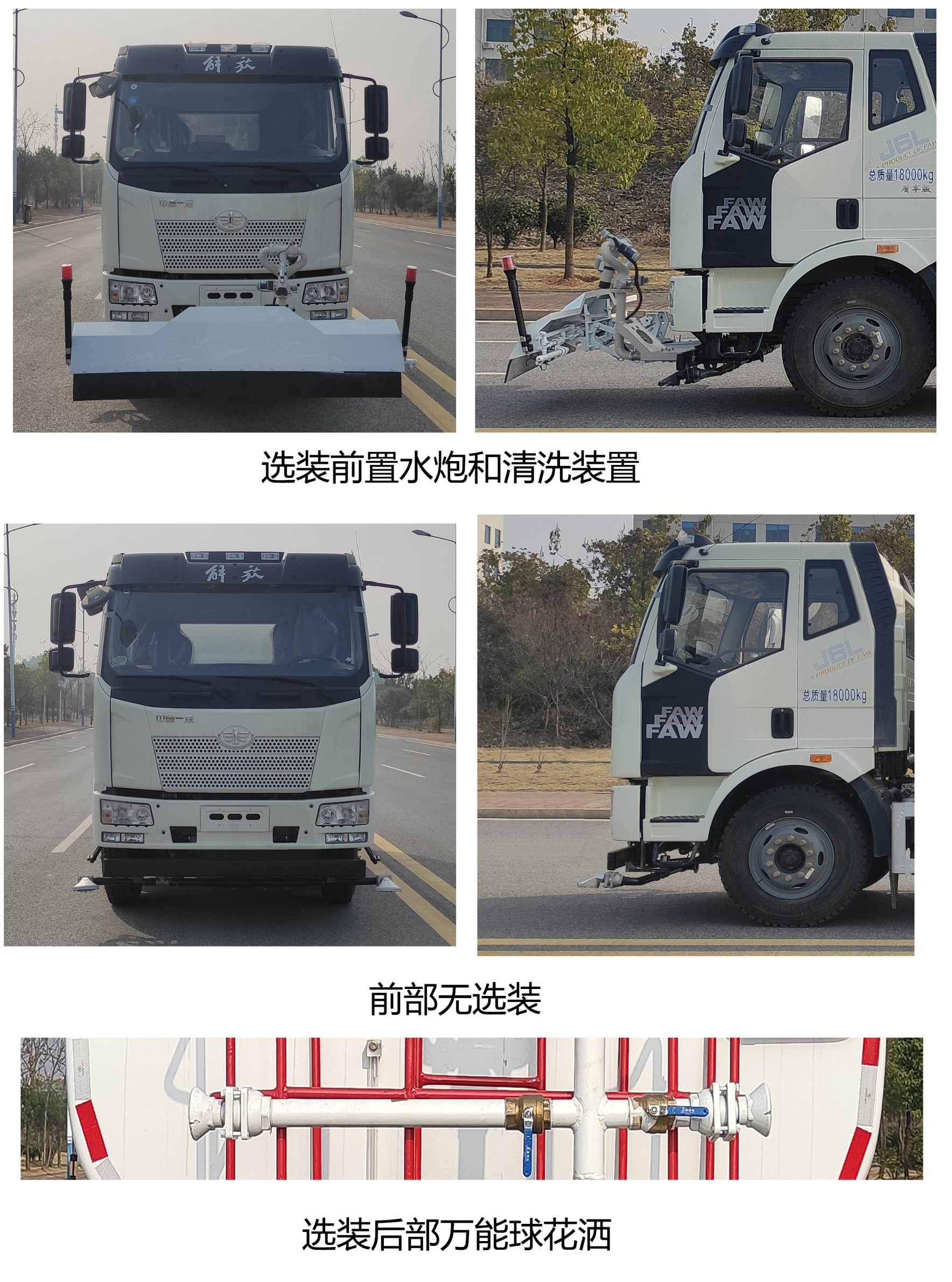 1.罐体有效容积:10.2立方米,罐体外形尺寸(长×长轴×短轴)(mm):4000×2420×1480;2.该车仅选用底盘轴距4500mm;3.侧防护装置材质为铝合金,通过连杆用螺栓安装在罐体底架大梁上.后防护装置材质为Q355B,截面尺寸为160×60mm,通过螺栓安装在底盘大梁上,下边缘离地高为480mm;4.该产品是以清洗路面为主的移动环卫车辆,专用装置为清水箱总成.该车装有水罐、水路系统、清洗工作装置、后作业平台、控制系统,用于清洗作业;5.可选装可选装前智能水炮,万能球花洒,自吸装置,以上选装对整车重量和尺寸均可忽略不计.车头可选装前喷架,对应前伸为950mm,对应车长为9155mm,该选装对整车重量可忽略不计;6.随底盘装有ABS,ABS型号/生产厂家:CM4XL/长春瑞立科密汽车电子有限公司.随底盘装备限速装置,限速89km/h,安装具有卫星定位功能的行驶记录仪;7.随底盘选装前围,选装宽体保险杠,脚踏板. |