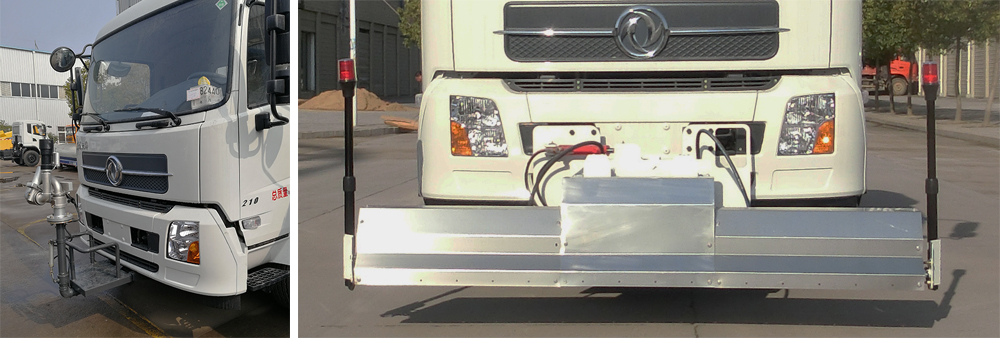 随底盘选装驾驶室,选装宽体前部清洗装置样式,前部清洗装置前伸1200mm;选装窄体前部清洗装置样式,前部清洗装置前伸600mm,选装前部不安装清洗装置结构。运输介质: 水,密度:1.0吨/立方米, 罐体有效容积:9.97立方米,罐体外形尺寸(长×长轴×短轴)(mm)4050×2400×1450,4250×2350×1450。ABS型号/生产厂家:3631010-C2000/东科克诺尔商用车制动系统(十堰)有限公司,ABS 8/东科克诺尔商用车制动系统(十堰)有限公司, 4460046450/威伯科汽车控制系统(中国)有限公司。侧面防护采用冷弯型钢/Q235-B,螺栓连接;后防护采用冷弯型钢/Q235-B,螺栓连接。后防护截面高度尺寸120mm, 截面宽度尺寸65mm,下边缘离地高度460mm。该车用于城市道路或隔离带的清洗作业,主要专用装置为清洗刷和水箱。车长/轴距/前伸对应关系为:8380/4500/0,8980/4500/600,9580/4500/1200,8580/4700/0,9180/4700/600,9780/4700/1200。 |
