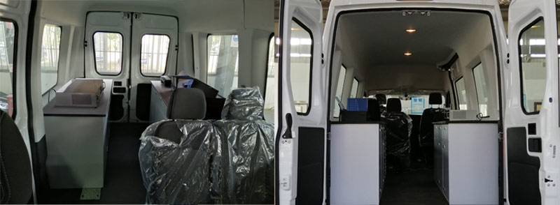 装备有装备有服务台、工具柜、打印机、电脑及电源设备;随底盘选装高位制动灯辅助照明,选装前雾灯,不带侧拉门;车顶选装喇叭、显示屏、倒伏式LED显示屏、车顶平台、照明灯、高杆照明灯、云台摄像机,可选装顶置空调,选装遮阳篷,选装尾部爬梯、侧后部盲窗;选装上掀门;车顶无选装时整车高度为2726mm,选装车顶平台、显示屏、照明灯时整车高度为2929mm,选装高杆照明灯、顶置空调高度为2966mm,,选装车顶平台装云台摄像机高度为3129mm,选装高杆照明灯带监控摄像机高为3179mm;ABS系统控制器型号:BOSCH ABS9,ABS系统控制器生产企业:BOSCH公司。发动机型号为F1AE8481D,发动机最大净功率93kW; |