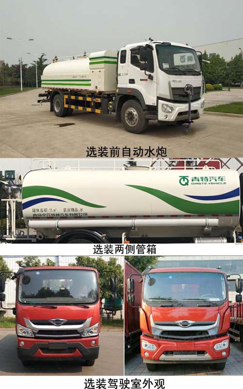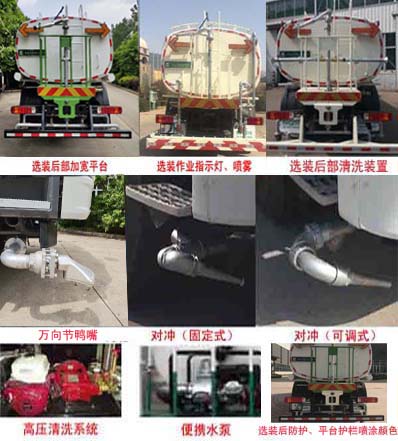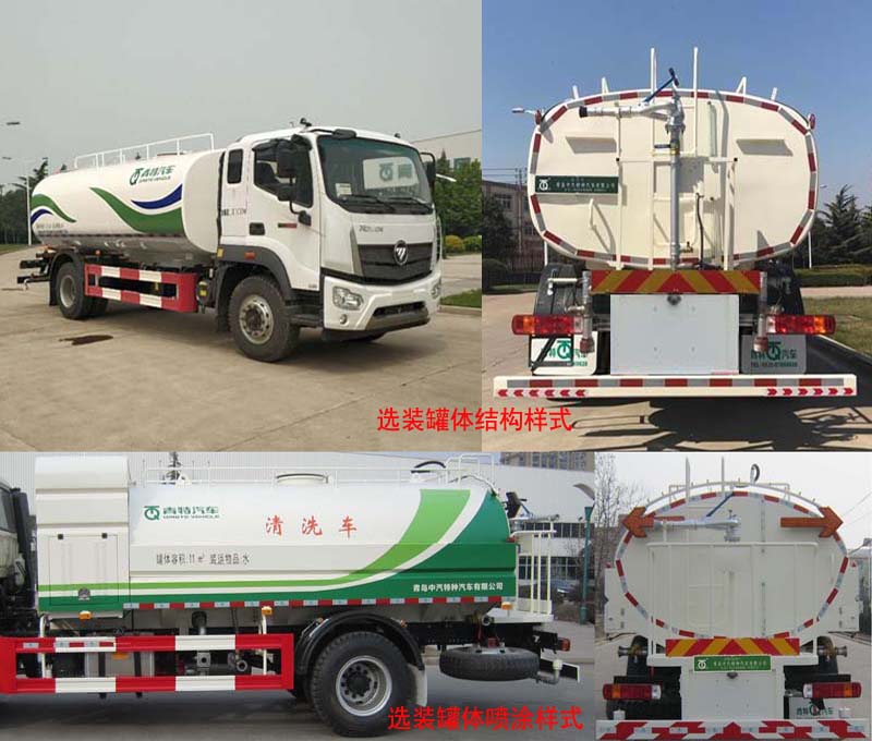 专用装置水罐体及清洗装置,主要用于道路清洗作业.采用4800mm轴距底盘.罐体有效容积11立方米,介质名称:水,介质密度1000千克/立方米.罐体外形尺寸(长轴×短轴×长度)(mm):2350×1500×4530.选装罐体结构(长轴×短轴×长度)(mm):2400×1420×4600.选装自动水炮,当安装自动水炮时,整车长8855mm,前伸320mm,接近角9°;不安装自动水炮时整车长8535mm,接近角14°.另可选装鸭嘴、对冲、高压清洗系统、便携水泵等装置, 选装后作业指示灯,选装车身涂装外观,选装两侧管箱、后部加宽平台、后部喷雾装置、后部清洗装置,选装后防护和平台护栏喷涂颜色.侧面防护装置材料:Q235,连接方式:螺栓连接;后部防护装置材料:Q235,连接方式:焊接,截面尺寸150mmX65mm,离地高度480mm.ABS生产厂家/型号: 广州瑞立科密汽车电子股份有限公司/CM4XL-4S/4M.选装驾驶室外观. |