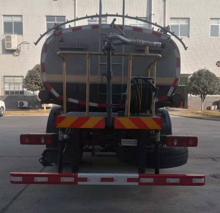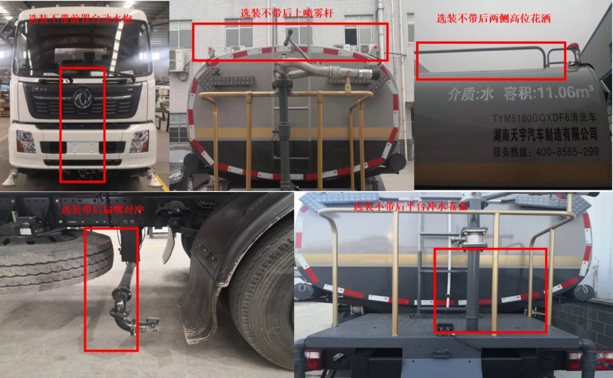 该车仅选用4700mm底盘轴距;该车运输介质为水,密度:1000千克/立方米,罐体有效容积为11.06立方米,水箱尺寸(长×长轴×短轴)(mm):5240×2200×1320。专用装置为水罐,水泵,管道系统等。用途:道路冲洗,圆林绿化,人形道,路沿,道路标线的清洗等。ABS型号/生产厂家:3631010-C2000/东科克诺尔商用车制动系统(十堰)有限公司,ABS 8/东科克诺尔商用车制动系统(十堰)有限公司,4460046450/威伯科汽车控制系统(中国)有限公司。侧防护装置与车架采用螺栓连接形式,铝合金材质。后防护装置与车架采用螺栓连接形式,后防为Q235材质:离地高度为490mm,断面为120mm×60mm。选装不带前置自动水炮、选装不带后上喷雾杆、选装不带后两侧高位花洒、选装不带后平台冲水卷盘、选装带后扁嘴对冲;其中带前冲鸭嘴时前伸为210mm,带前置自动水炮时前伸为660mm;标配带前置自动水炮时全车长-前后悬-前伸对应关系为9220-1430/2430-660(mm);选装不带前置自动水炮时全车长-前后悬-前伸对应关系为8770-1430/2430-210(mm)。 |