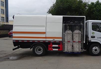 整车外形尺寸为5387,5637,5995×2200×2600(mm),容积大,额定载质量达到2630(Kg),有效保证运水量,罐体前面左侧安装了清洗刷、清洗机、洗管装置等配置,另外,还有一套手动的高压喷抢,配合作业,胜任各种工况。