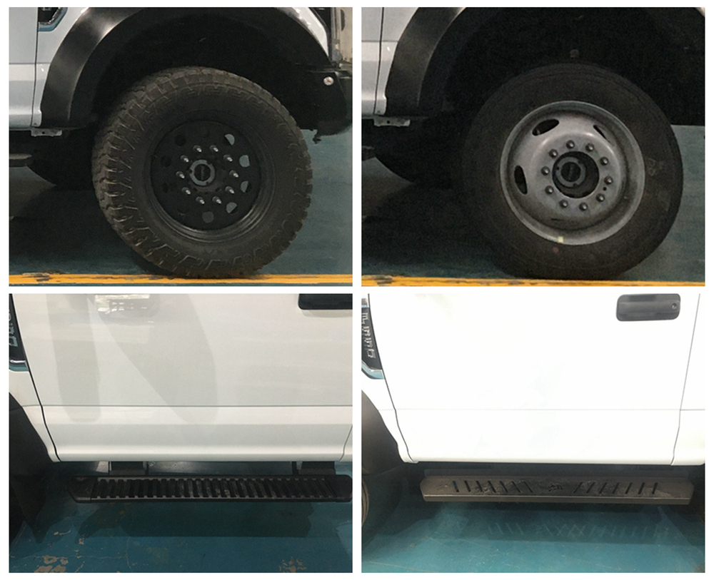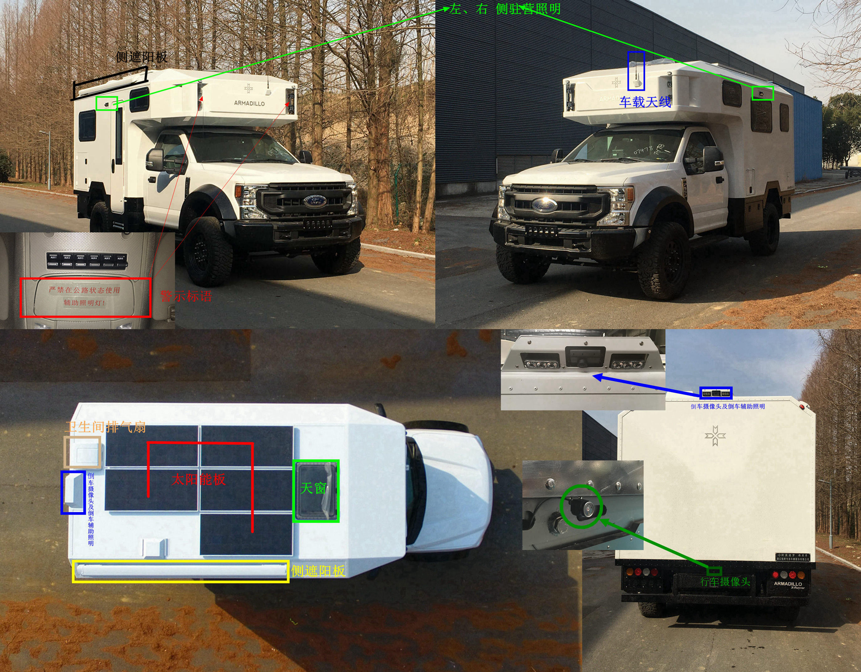 发动机最大净功率255kW。侧防护为裙板结构,材质为高强度铝合金,离地高度为440(mm),后防护为钢质,截面尺寸:100X50(高X宽,单位:mm),离地高度为:495(mm),连接方式为:螺接。ABS型号:****-2B373-**;ABS生产企业:FOMOCO。车厢内部配备桌椅、床、厨具、洗菜洗脸池、马桶、淋浴、空调等生活设施。车头灯具为选装,仅限人员在野外非道路状况下工作和生活照明使用。该车标配视频行车记录仪。根据GB1589-2016中A3.3和A.4.2“不在测量范围的装置”中的描述:车厢尾部两侧的示廓灯、尾部中间的摄像头组件(组件含外罩、摄像头、摄像头辅助照明等,超出车厢尾部20mm)不在长度测量范围;左右两侧辅助营地照明,以及门、窗的铰链和把手,窗户上的导水槽,不在宽度测量范围。整车最高点为尾部卫生间排气扇,选装的太阳能板、天窗等不影响整车高度。 |