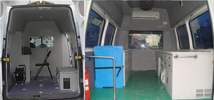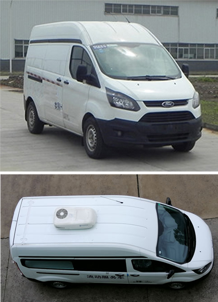 选装前脸样式,选装后视镜样式,选装轮毂罩样式,选装盲窗,选装顶部换气扇;ABS系统控制器型号:EV5051,生产厂:博世汽车部件(苏州)有限公司。车内安装备有服务台,用于流动服务。 |