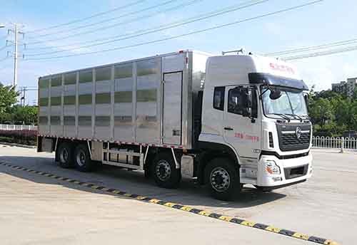 畜禽运输车又被叫做运猪车、拉猪车、鸡苗运输车,是一种主要用来运输活禽类的专用车型,有仓栅式和厢式两种结构形式,前一种结构比较简单,适合短途运输,而后一种配置上比较高端,适合活禽的长途运输,能够最大程度的保证活禽成活率,提高运输效率,那接下来就给大家介绍一款优质的畜禽车,即楚飞牌东风天龙前四后八国五铝合金畜禽运输车畜禽运输车,这款畜禽运输车有着怎样的配置呢?