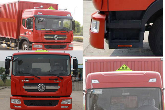 EBS型号/生产厂家:EBS/ESC-d/襄阳东风隆诚机械有限责任公司;安装有限速装置;限速装置限速(km/h):80;安装有具有卫星定位功能的行驶记录仪;选装描述:随底盘选装同系列的高顶驾驶室,选装气喇叭,遮阳罩,绿色滤光带,踏步.该车型可选装ETC车载装置.选装侧门型式及位置,选装侧门数量,选装不开侧门,厢体侧面板选装开百叶窗,选装瓦楞板结构;发动机/油耗值(L/100km)对应关系为:B6.2NS6B230/26.7,D4.5NS6B220/26.6,YCS04200-68/26.4,CY4SK761/26.8;侧后防护情况:侧,后防护材料均为Q235,侧,后防护均为焊接加螺栓连接,后防护截面尺寸120×50mm,下边缘离地高450mm;车厢顶部封闭且不可开启;运输独立容器(瓶)包装的货物;危险货物类项号:2.1,2.2;运输易燃气体时挂2.1类警示牌,运输非易燃无毒气体时挂2.2类警示牌;其他说明:该车为危险货物运输车.仅选用排气管前置,前轮盘式制动及子午线轮胎的底盘.后轴采用空气悬架.转向轮安装轮胎爆胎应急防护装置,整车长度/轴距/后悬/(mm)对应关系:8550/4700/2590,9150/5300/2590,9950/5600/3090. |